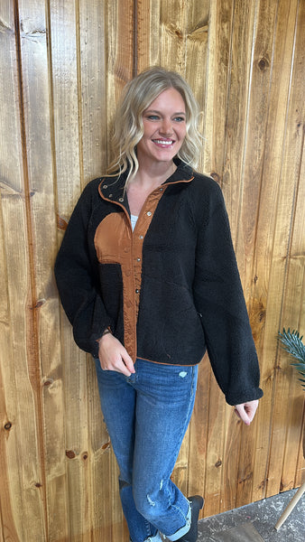 D SNAP BUTTON DOWN LONG SLEEVES POCKETS COLORBLOCK TEDDY FLEECE JACKET OUTERWEAR NOT LINED 100% POLYESTER