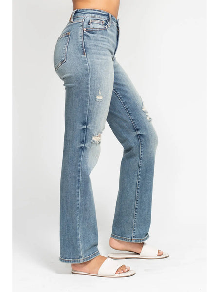 Indulge in the ultimate denim experience with our High Waisted Dad Straight Jean from Judy Blue Jeans. This contemporary design features a high waist and a straight leg cut, making it a perfect choice for everyday casual wear. With its medium wash and solid color, it is a versatile addition to your fall/winter wardrobe. The jeans are crafted from a blend of 93% Cotton, 6% Polyester, and 1% Spandex, ensuring a comfortable fit. Hand washing is recommended to maintain the quality of the fabric. This ankle-length jean is perfect for the modern woman looking for comfort and style. Front rise is 11 and inseam is 32. Experience the difference with Judy Blue Jeans.