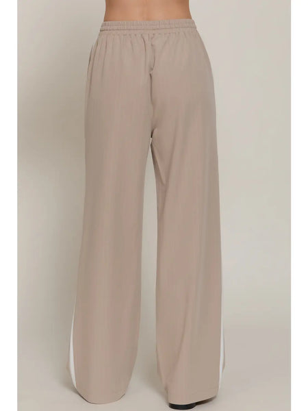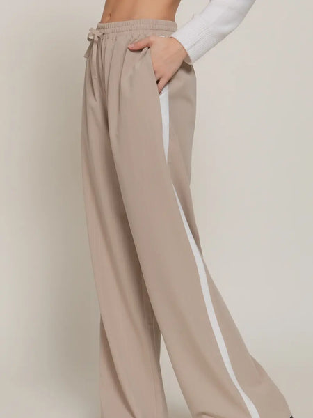 SIDE STRIPE DETAIL Y/D STRIPE LONG PANTS WITH DRAWSTRING FABRIC: Y/D STRIPE POLY SPAN WOVEN 74% POLYESTER 20% RAYON 6% SPANDEX