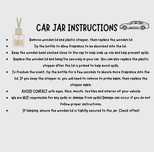 ar fresheners/Car Jar These little cuties last approximately 60 days in the winter & 30 in the summer. Phthalate Free These car jars will make your car smell fresh, plus they're absolutely adorable. Prior to use twist off the wood top, take out the plastic plug, twist the wood top back on, and hold the jar upside down for a few seconds to disperse the oils. The wood cap acts as the "wick" like reed diffusers. If you notice your jar not smelling, turn it upside down to saturate the wood cap. When you do this ensure your cap is still secure! The liquid and friction from movement can cause these to come loose, check often! To help reduce the chance of spills, prime the lid and replace the stopper. You will need to remove the stopper each time your lid needs primed. Damage can occur if you do not follow proper instructions.