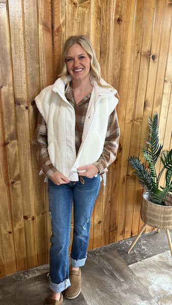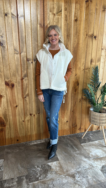 Embrace comfort and style with this sherpa vest jacket, perfect for layering. Its unique functional side tie-ups, offers a snug, adjustable fit. Features a snug mock neck and button down front for easy wear. Ideal for transitioning seasons, pair it with your favorite slim jeans or leggings for a cozy. Elevate your ensemble with this outerwear on a breezy evening out or a casual day in the city. 100% Polyester Model Is 5' 7" Tall, 32" Chest, 25" Waist, 34" Hips And Weari