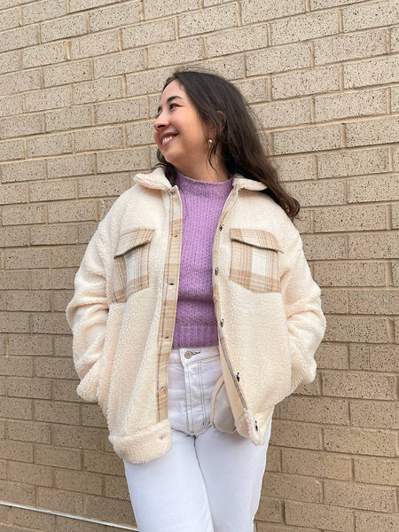 Sherpa shacket with collar and Plaid contrast detailing Front plaid flap pockets with button closure 90% polyester, 10% nylon
