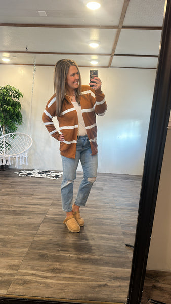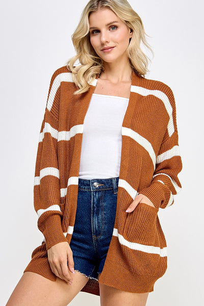 Oversized silhouette with dropped shoulders Bold flowing stripe pattern for a relaxed yet striking look Soft, chunky knit offers lightweight warmth Hip-length design perfect for layering Functional front pockets Cozy texture that's easy to throw on every day Roomy sleeves with ribbed cuffs for a secure fit Open front style for an effortless vibe Style: Relaxed casual, cozy layering, effortless chic Perfect for: Weekend outings, coffee dates, casual dinners - whenever you want to stay comfortable without sacrificing style. Self: 100% Acrylic