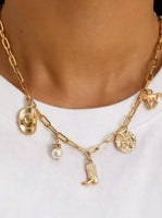 Western Boot Star Hat Horseshoe Charm Necklace, this charming piece features iconic western symbols, including a cowboy boot, a star, a hat, and a lucky horseshoe, all hanging from a stylish chain. Perfect for adding a rustic yet trendy touch to your outfit, this necklace celebrates the adventurous western lifestyle. Product Details: length: charm: ext: 3" Ball Chain Ext